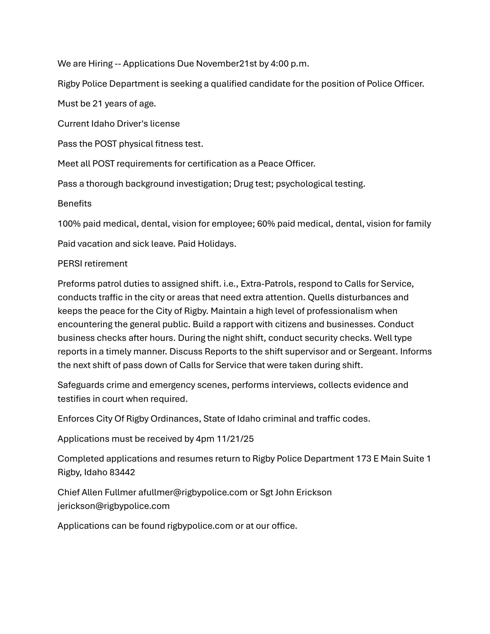 The City of Rigby is a great place to work! We offer full benefit packages, regular hours, and a respectful working environment. We are an Equal Opportunity Employer, Veteran's preferance and Drug Free Workplace. Come join our team!