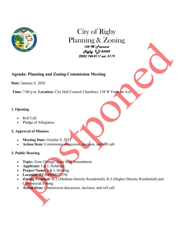 January 8, 2026 – Planning & Zoning Agendas – Postponed